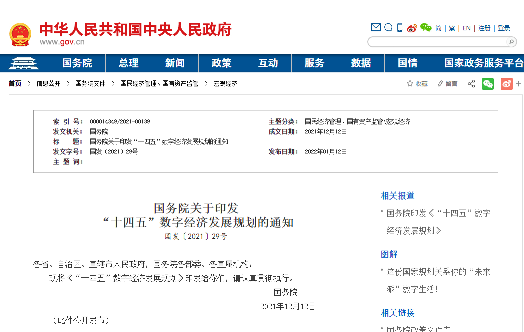 1月12日,國務(wù)院印發(fā)《“十四五”數字經(jīng)濟發(fā)展規劃》(以下簡(jiǎn)稱(chēng)《規劃》),明確了“十四五”時(shí)期推動(dòng)數字經(jīng)濟健康發(fā)展的指導思想、基本原則、發(fā)展目標、重點(diǎn)任務(wù)和保障措施。