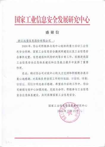 遠望信息獲國家工業(yè)信息安全發(fā)展研究中心致信感謝