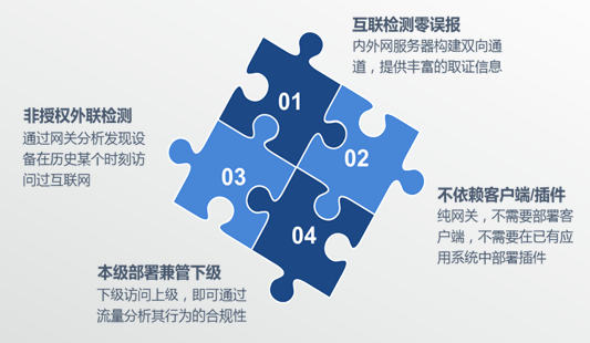 采用旁路部署方案,無(wú)需依賴(lài)客戶(hù)端,滿(mǎn)足等保中“安全區域邊界”監測防護要求,重點(diǎn)彌補現有服務(wù)器、網(wǎng)絡(luò )設備、安全設備等非授權外聯(lián)無(wú)法有效發(fā)現和防護的安全短板。
