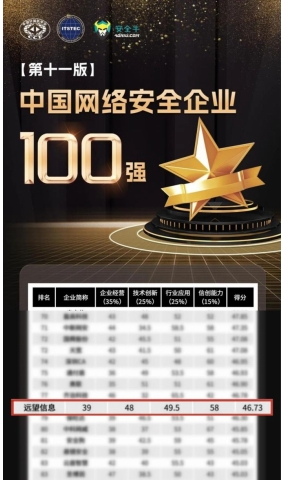 此次再度入選100強榜單,是對遠望信息綜合安全實(shí)力的權威認可。面向未來(lái),遠望信息也將秉持初心,一如既往以技術(shù)創(chuàng )新為發(fā)展源動(dòng)力,不斷為用戶(hù)提供更豐富、安全價(jià)值更高的解決方案與服務(wù),護航數字化改革與轉型,助力網(wǎng)絡(luò )安全行業(yè)高質(zhì)量發(fā)展!