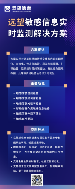 為降低敏感信息及文件的泄露風(fēng)險,有效保障敏感信息安全,遠望信息針對性推出了遠望敏感信息實(shí)時(shí)監測解決方案,實(shí)現對計算機終端敏感文件和內容的網(wǎng)絡(luò )化、自動(dòng)化、常態(tài)化監管,通過(guò)終端提醒、引導處置、阻斷控制等終端智助,有效避免違規存儲、處理和傳遞敏感信息行為的發(fā)生。